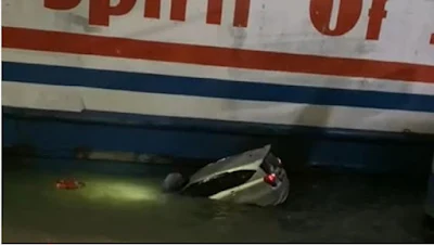 Mobil mini bus jenis Daihatsu yang tengah berada di atas Kapal Fery Shalem tercebur ke laut di Dermaga 2 Pelabuhan Merak, Banten, pada Jumat (23/12) malam.